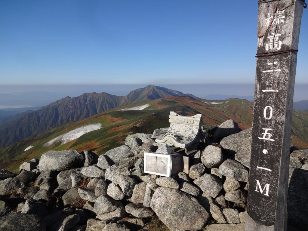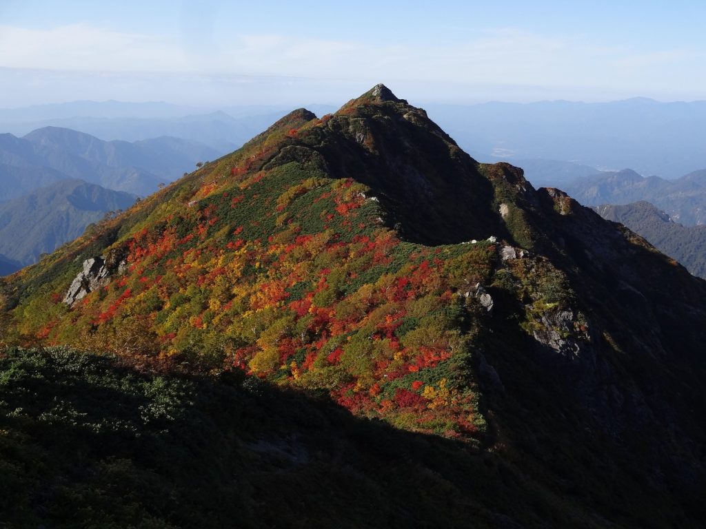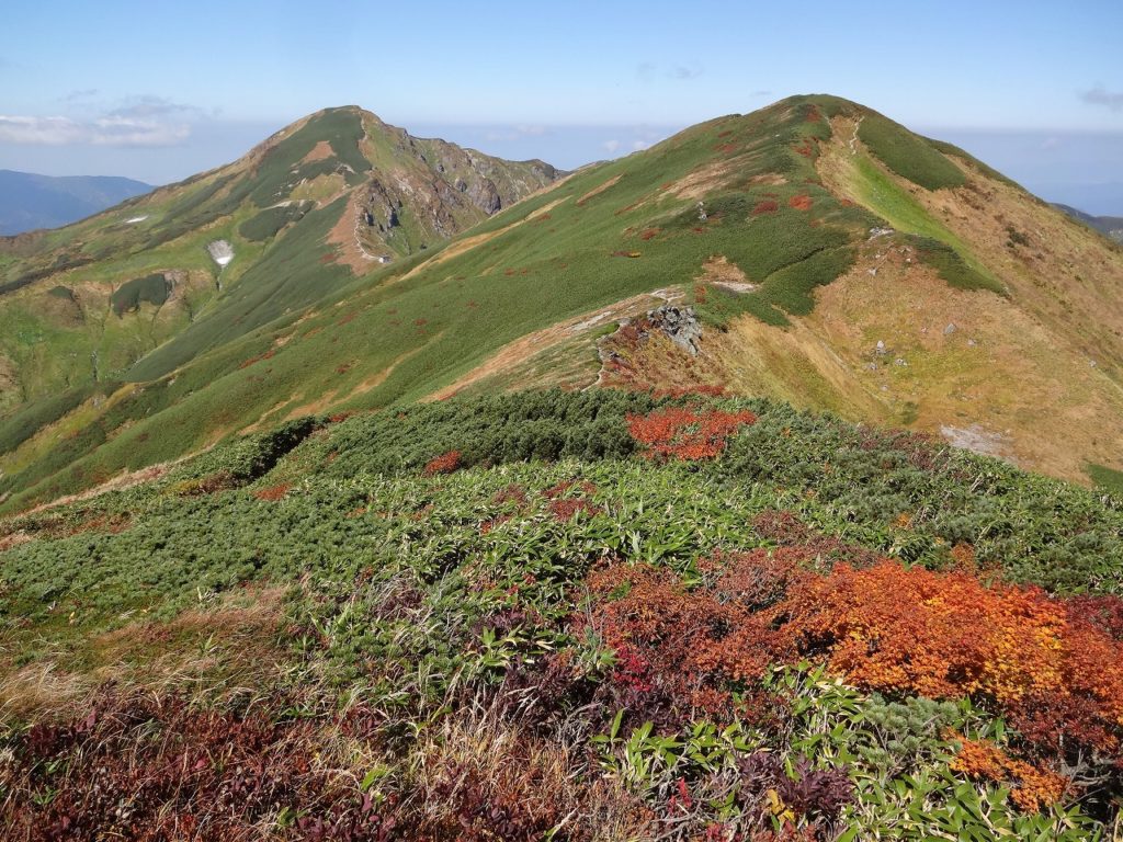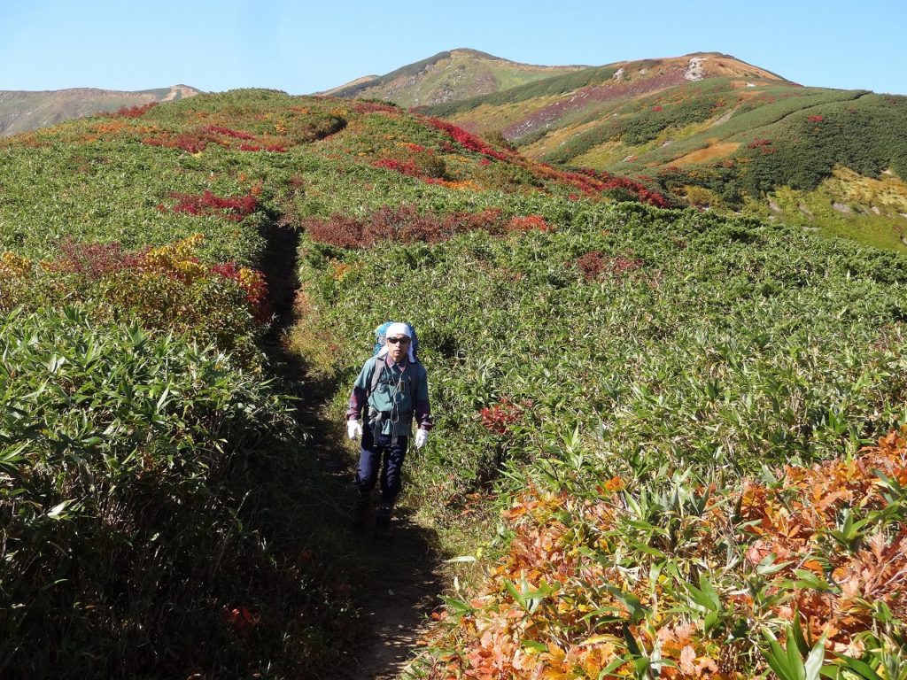 吊り橋を渡り終えて時計は午前8時を回ってしまいました。自宅から車で飯豊山荘までは2時間30分です。そこから登山口の温身平まで徒歩30分、吊り橋までさらに40分、そう、もう少し早く出ればよかったのです。とはいえ、天気がもう素晴らしく、抜けるような青空に見事な紅葉が映えます。大嵓の急登なんのその。私はどんどんどんどん高度を稼いでいきました。水は1ℓ、荷物は装備を極限まで削って10kgに抑えています。軽いのです。だから喉はそれほど乾かず、大汗もかきません。疲れる前に、カメラや双眼鏡を取り出して一息入れて遊び遊び、登っていきました。吊り橋から3時間で千本峰到着。さすが、山遊び人です。