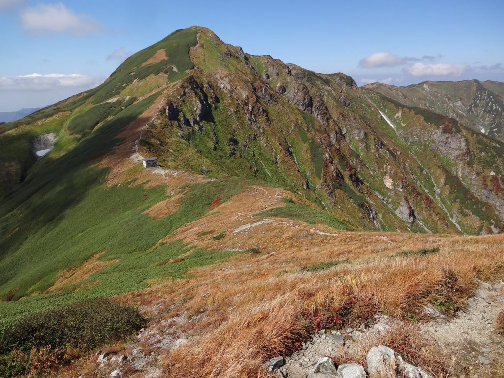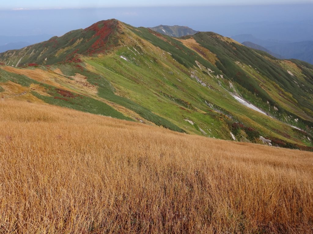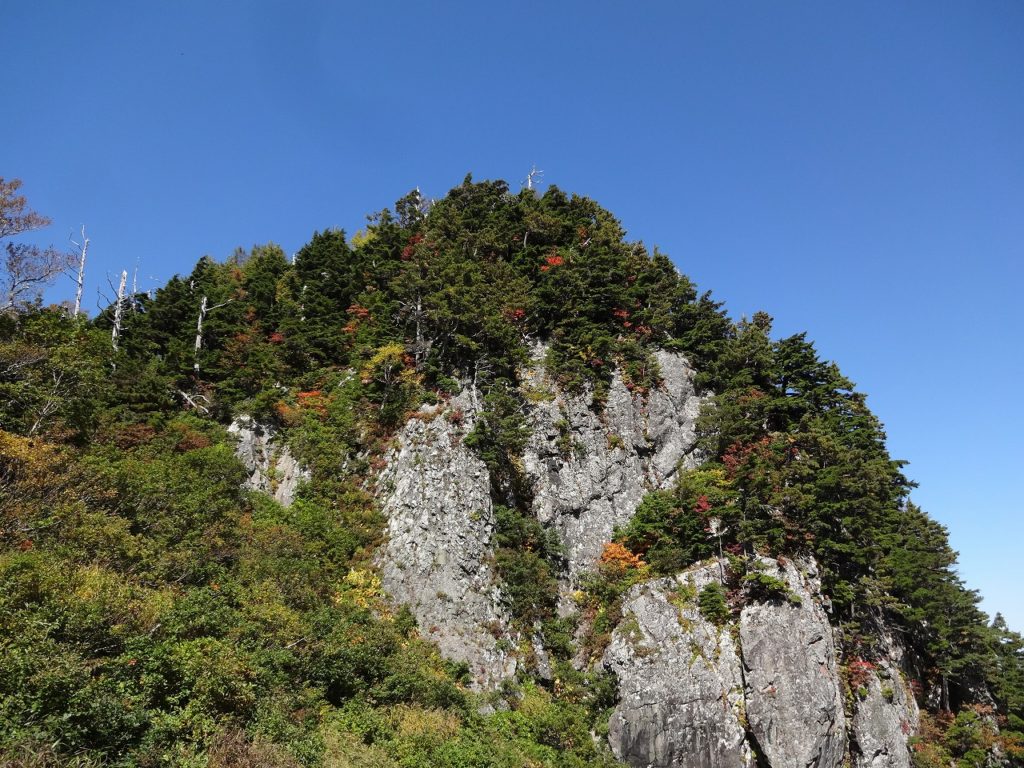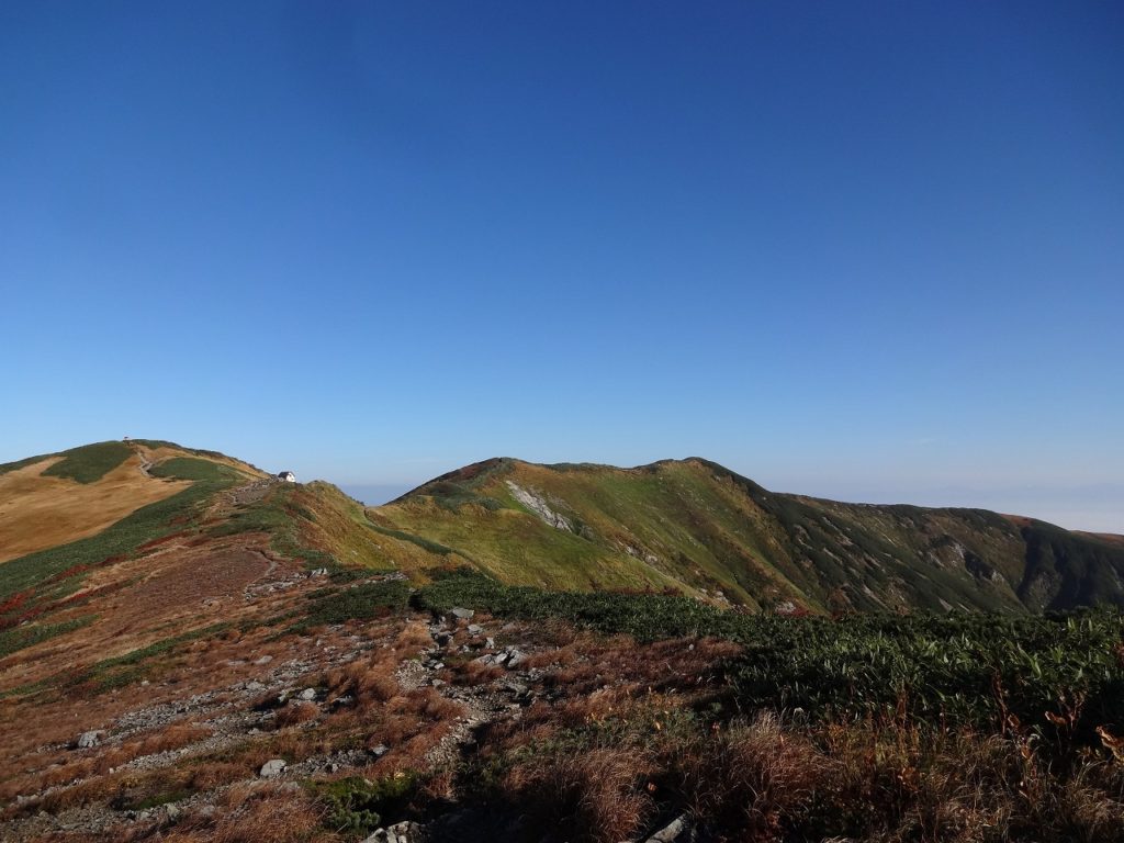 吊り橋を渡り終えて時計は午前8時を回ってしまいました。自宅から車で飯豊山荘までは2時間30分です。そこから登山口の温身平まで徒歩30分、吊り橋までさらに40分、そう、もう少し早く出ればよかったのです。とはいえ、天気がもう素晴らしく、抜けるような青空に見事な紅葉が映えます。大嵓の急登なんのその。私はどんどんどんどん高度を稼いでいきました。水は1ℓ、荷物は装備を極限まで削って10kgに抑えています。軽いのです。だから喉はそれほど乾かず、大汗もかきません。疲れる前に、カメラや双眼鏡を取り出して一息入れて遊び遊び、登っていきました。吊り橋から3時間で千本峰到着。さすが、山遊び人です。