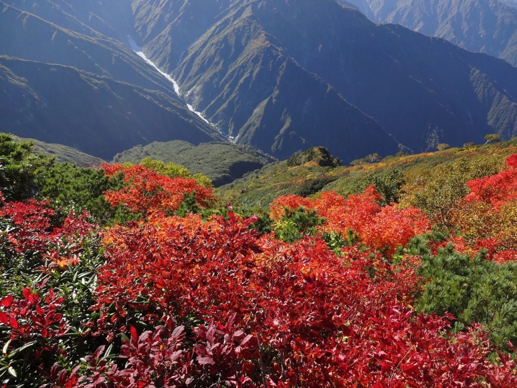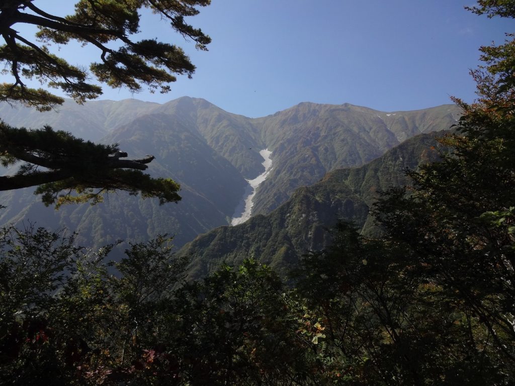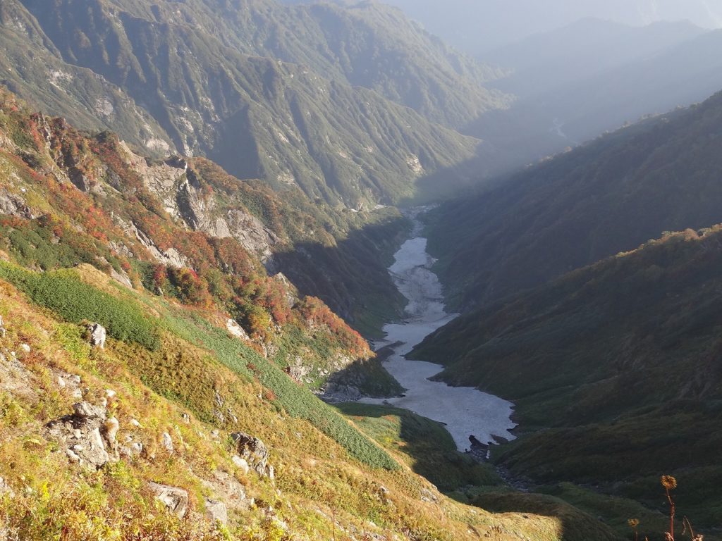 梶川尾根まで到達しました。ぐんぐん高度を下げて着陸態勢に入ります。途中、滝見場という場所から梅花皮大滝や石転び雪渓を見ることができました。「ああ、いがった。今度は杁差岳まで行ってみようかな。来年になるかもしれないけど・・・。」人生に分かりやすい目標があるとメンタルの健康に計り知れない貢献をするのだと、私は経験上知ってます。