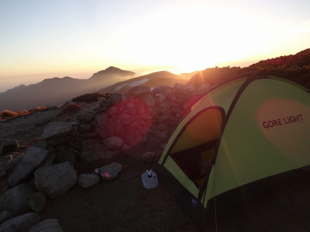 ところがです。私の両足君が突如、「もう、やってらんねえ!」と、ストライキを起こしてしまいました。そして、ふくらはぎ、すね、内もも、外もも、伸ばす筋肉も曲げる筋肉もぜーんぶ突っ張らかって、ただの棒切れのようになってしまいました。すんごく痛みます。致し方なく、しばし呆然と足を投げ出し休憩です。ややしばらくすると、5分休むと5分歩けるようになり、進むことができましたが、テントサイトについたのは日没間際の5時30分となってしまいました。ま、ギリギリセーフ。