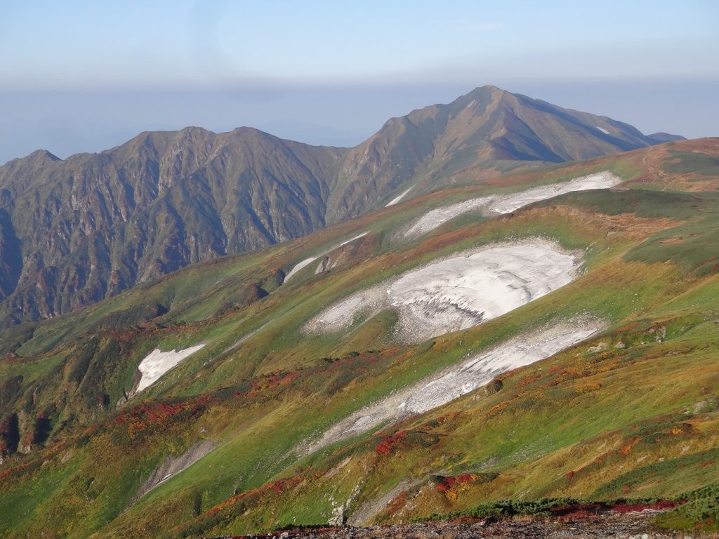「凍結破砕作用と,融雪水・ジェリフラクションによる破砕物質の除去によって,残雪の周囲では浸食が進み,雪窪(ゆきくぼ)snow niche,nivation hollowとよばれる浅い凹地が発達する。これが残雪の存在によってもたらされる雪食作用である。」(世界大百科事典)とあります。植生も貧弱にならざるを得ず,ますます窪んでいくのでしょう。それにしても、この時期の雪田の周囲は新緑から紅葉までグラデーションがかかり、彩が豊かですね。あと2週間もすれば初冠雪になります。山はじっとしていてくれません。