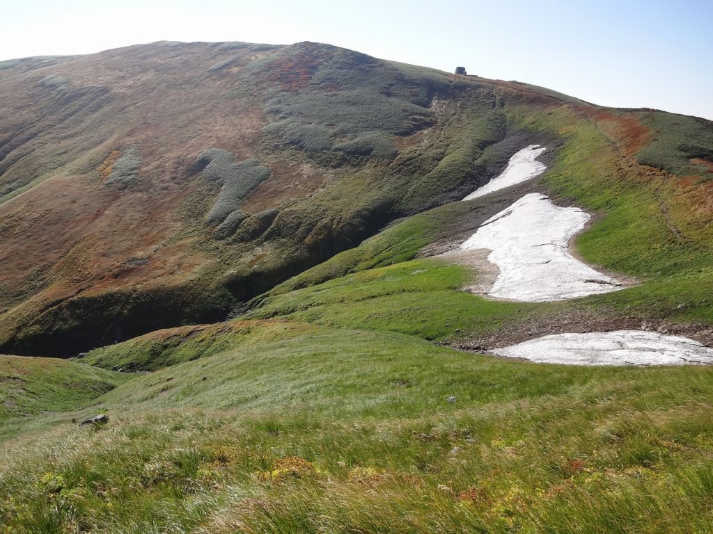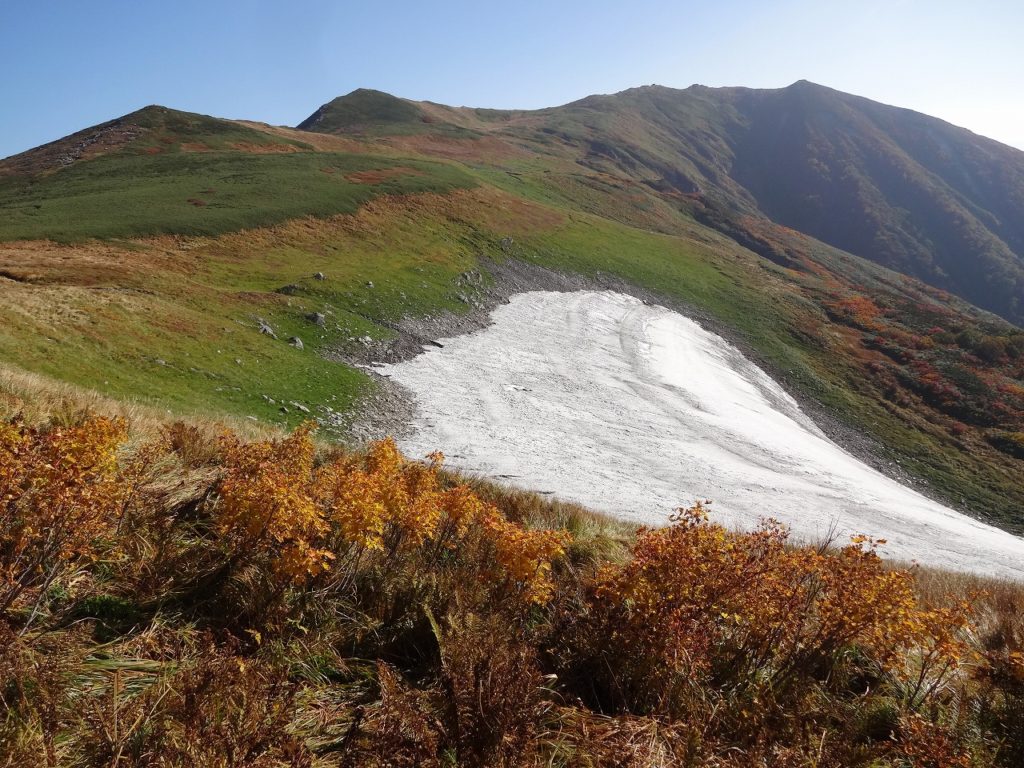 雪田の周りは常に若葉が芽吹きます。これをツキノワグマが食べます。2020年、御西小屋から数百メートル北上したあたりでクマと登山者が遭遇する事故が発生、目撃事案も複数ありました。遭遇した方はストックで応戦し、クマは山形側から新潟側へ遁走。撃退できたと聞き、私のストックは普段はザックに1本仕舞っているのですが、はい、手に持つようにしました。無邪気なクマさんが怖いのです。
