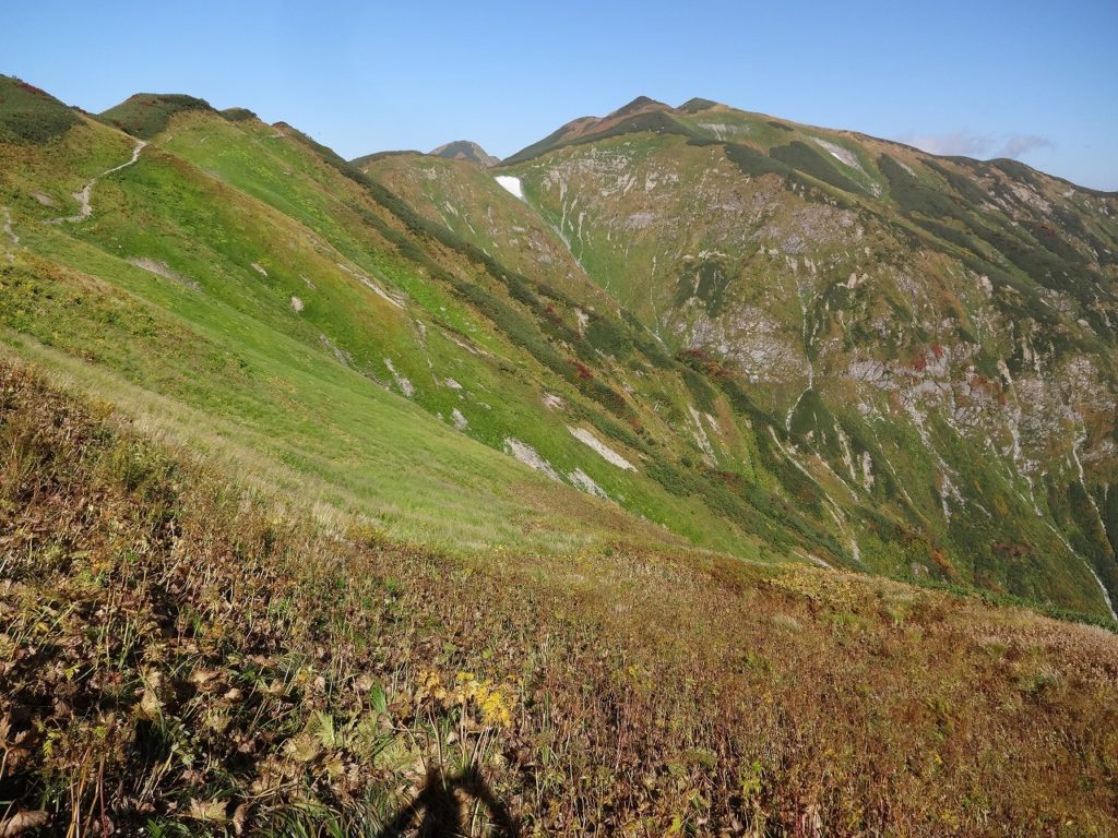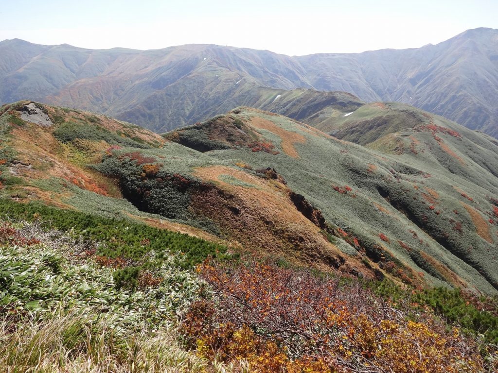 地獄のような大嵓尾根でした。しかし、一旦主脈に到達してしまえば、尾根を緩やかに登り下りしながら原始の景観を味わえるのが飯豊の良さ。最高です。飯豊の尾根は朝日よりどっしりと太く、神室の尾根は朝日より細く東北一の痩せ尾根と言われています。(ほとんど県内の山しか登ってない私には、誰が言ったかは知りません。)どの山も違いますけど、それぞれ、いいところであります。