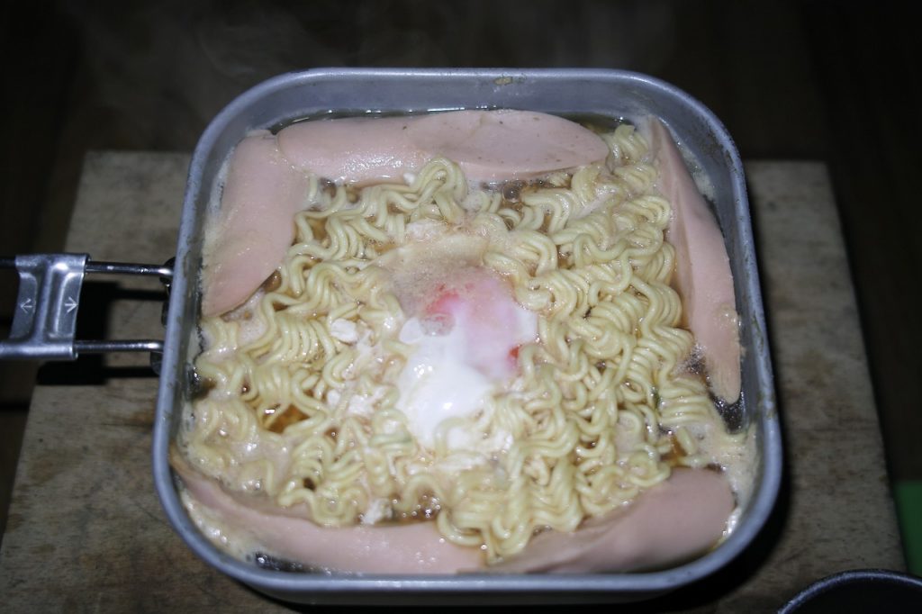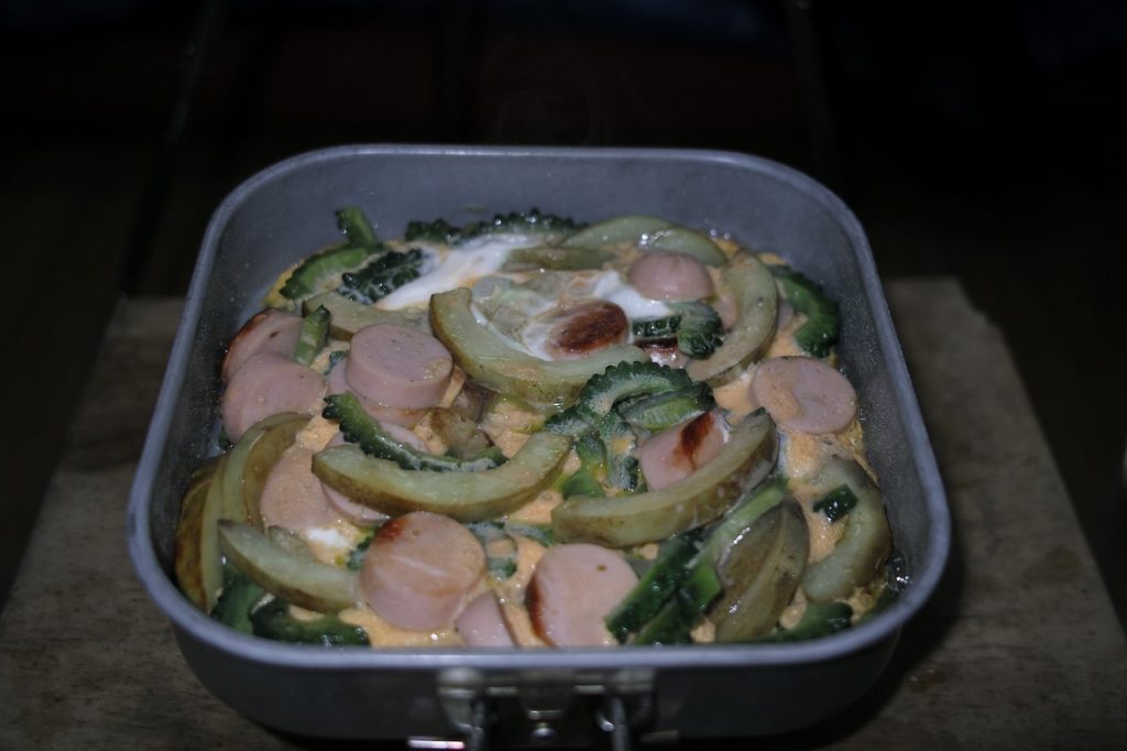 あとはお酒を雨天ボーナスとして少し余計にします。私は荷が重くなるのは大嫌いでリュックは10キロ未満と決めていますが、雨のご褒美とするのです。 で、今回は苦みのコラボレーション「ゴーヤー&アケビチャンプルー」と「豪快魚肉ソーセージラーメン」の2品でした。これとビール、日本酒を持ち込み、そこはかとなく朝日連峰竜門山の夜は更けゆくのでありました。