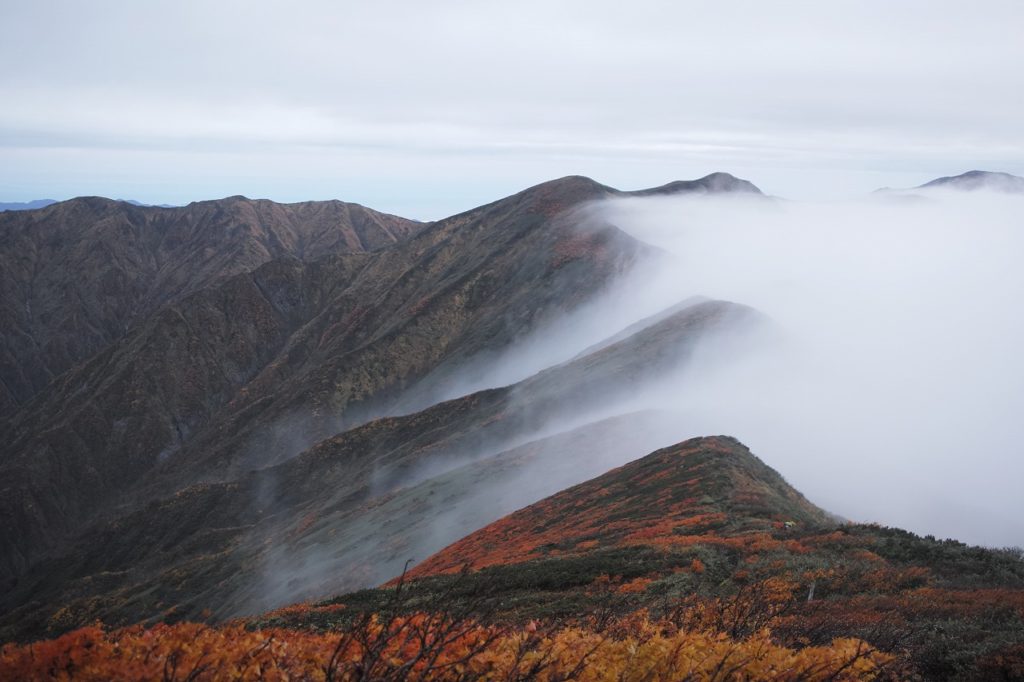 朝日連峰の紅葉はこの時期、稜線から中腹あたりまで進み、全山燃えるような美しさです。さすがに「これは見逃せない!」と思う人が多いのは頷けますね。隠れた名山の代表でもある朝日連峰が、一年で一番の過密状態になり、登山口に駐車するのもひと苦労、避難小屋はすし詰めを覚悟することになります。いつも、ほどほどに山遊びしたい私は、地元の山には感謝こそしても、不満など微塵もございません。しかしながら、10月の第一週の休日は騒がしくてどうも苦手です。