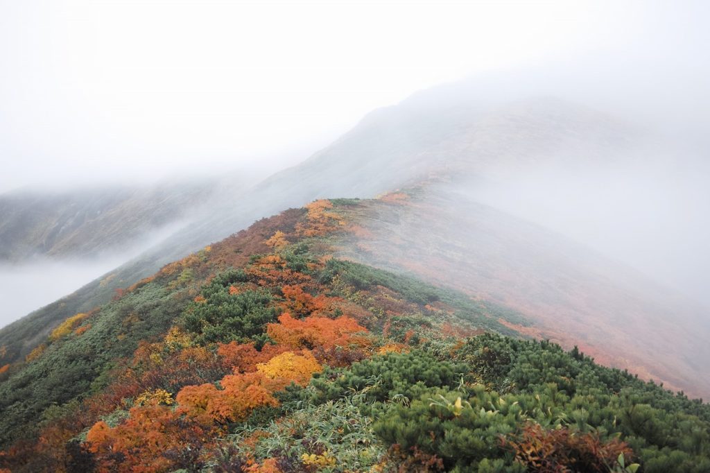 でもね、天気予報によれば、この空は遠い台風の影響らしく気温は高め、風も弱そうでした。私はほくそ笑みました。雨模様は残念ですが、実は快適な山行はできるんですね。自信ありです。兎に角、賑やかなおばちゃんたちもトレイルランニングであおり運転してくる若者(べつに両者を否定しているわけではないですよ。)も少なくなり山は静かになります。見晴らしは効きませんが、東北アルプス朝日連峰秋雨山行の楽しみはいろいろとあります。