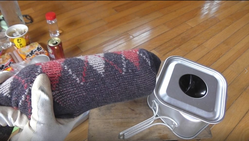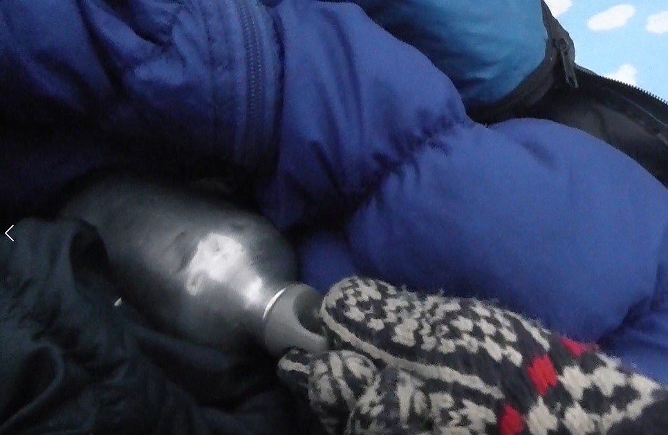 体温の上がりにくい手足に付ける軍手や靴下は金属の水筒にお湯を入れて湯たんぽを作り、かぶせます。乾燥するまで30分かかりません。以降は極めて快適な山小屋ライフとなります。